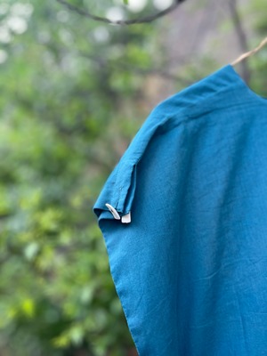リトルイーグルのコットン素材のフレンチスリーブトップス。 裏地がついているので一枚で着用できます。 ワンポイントの三日月刺繍が素敵。 袖片側に貝ボタンつき。 単品使いはもちろんのこと、同素材のパンツと合わせてセットアップにしても。