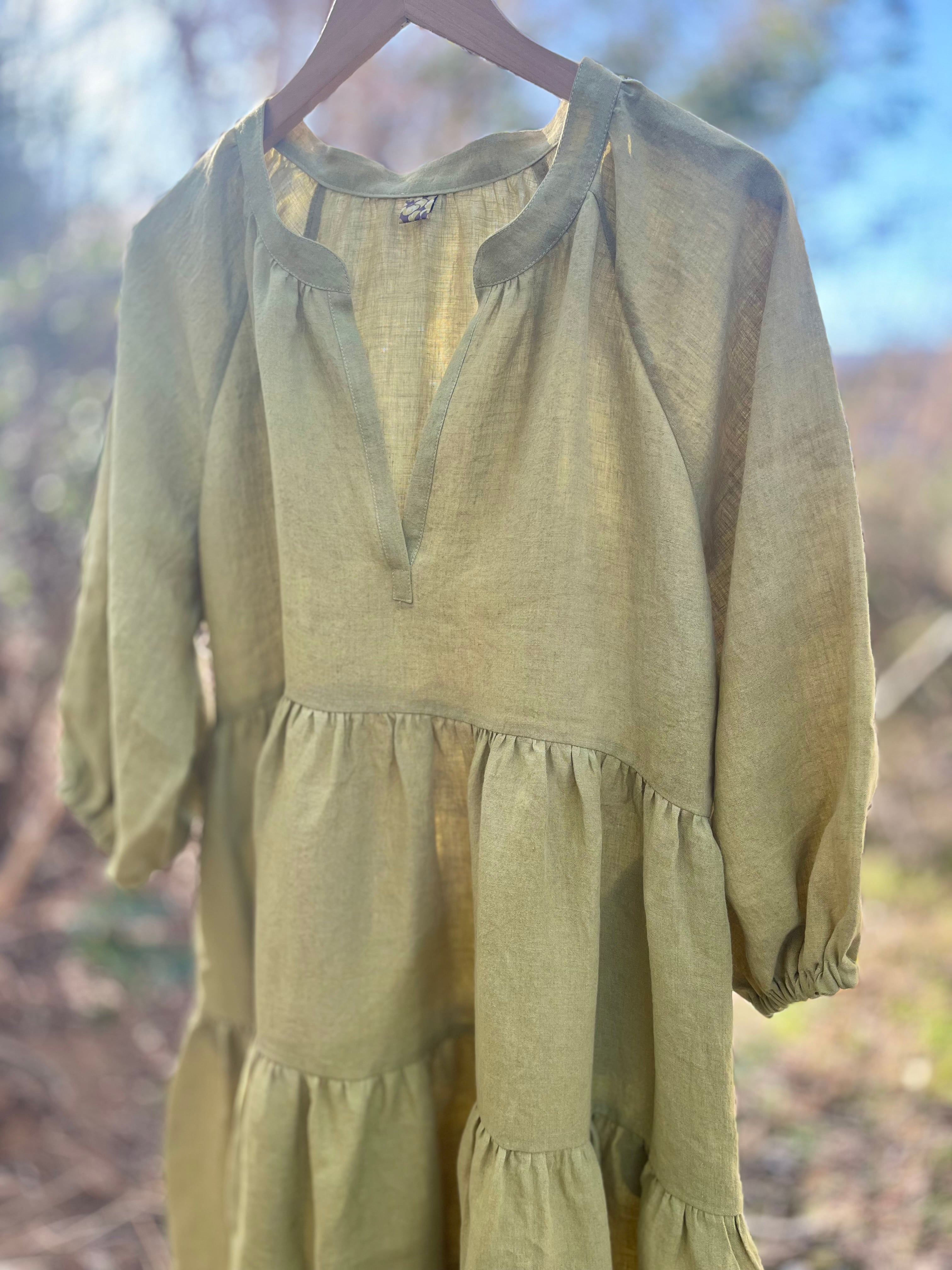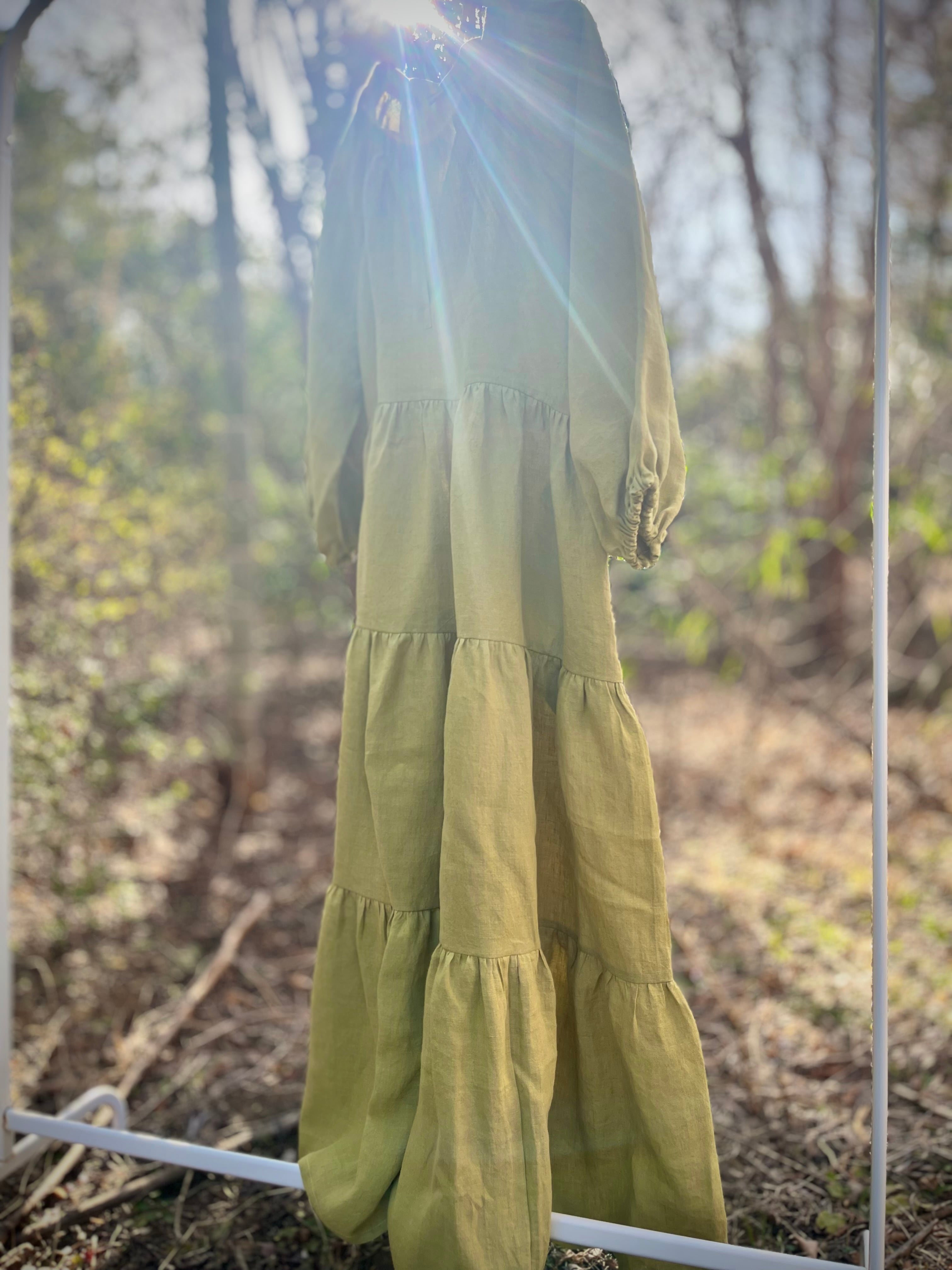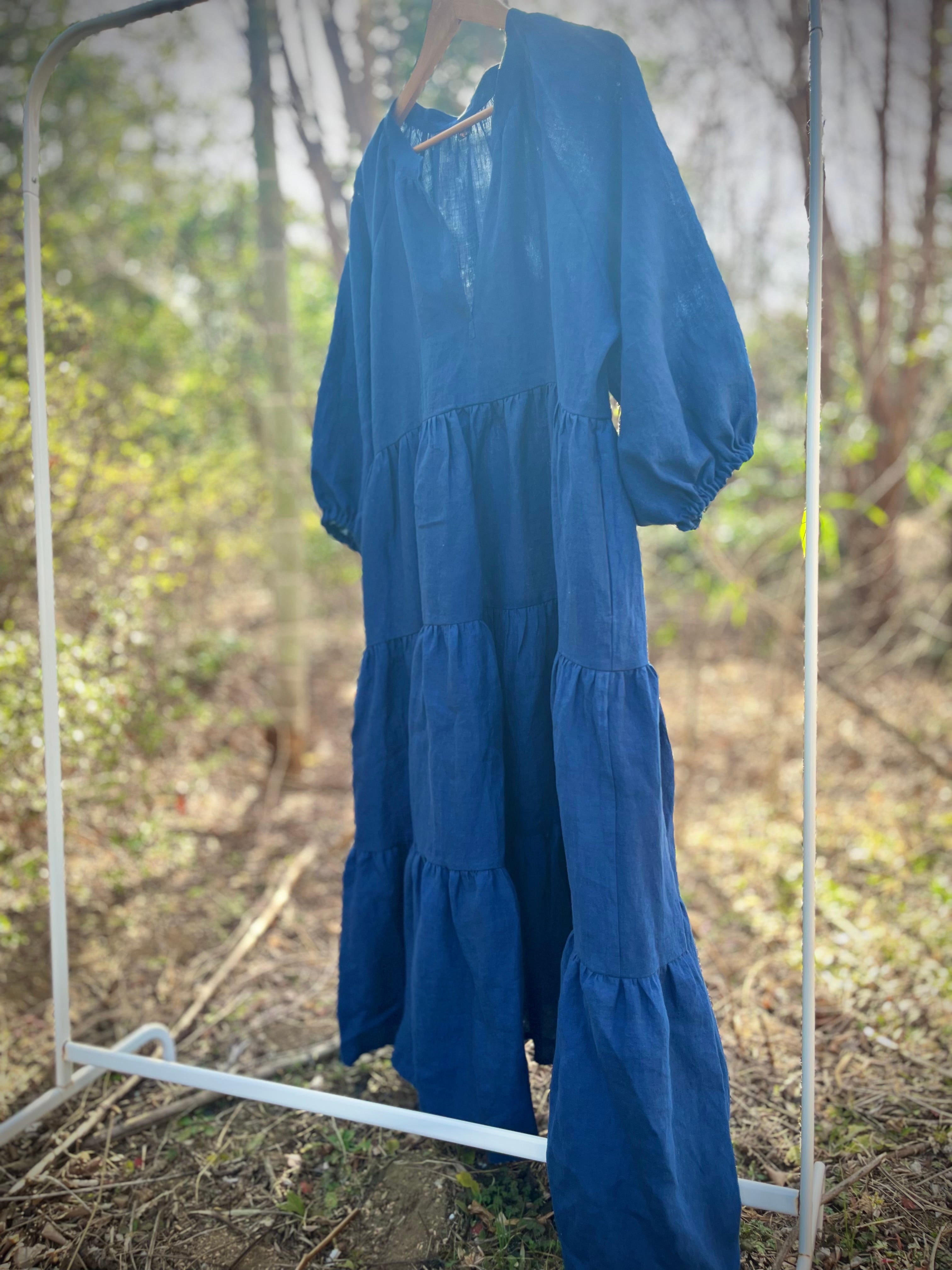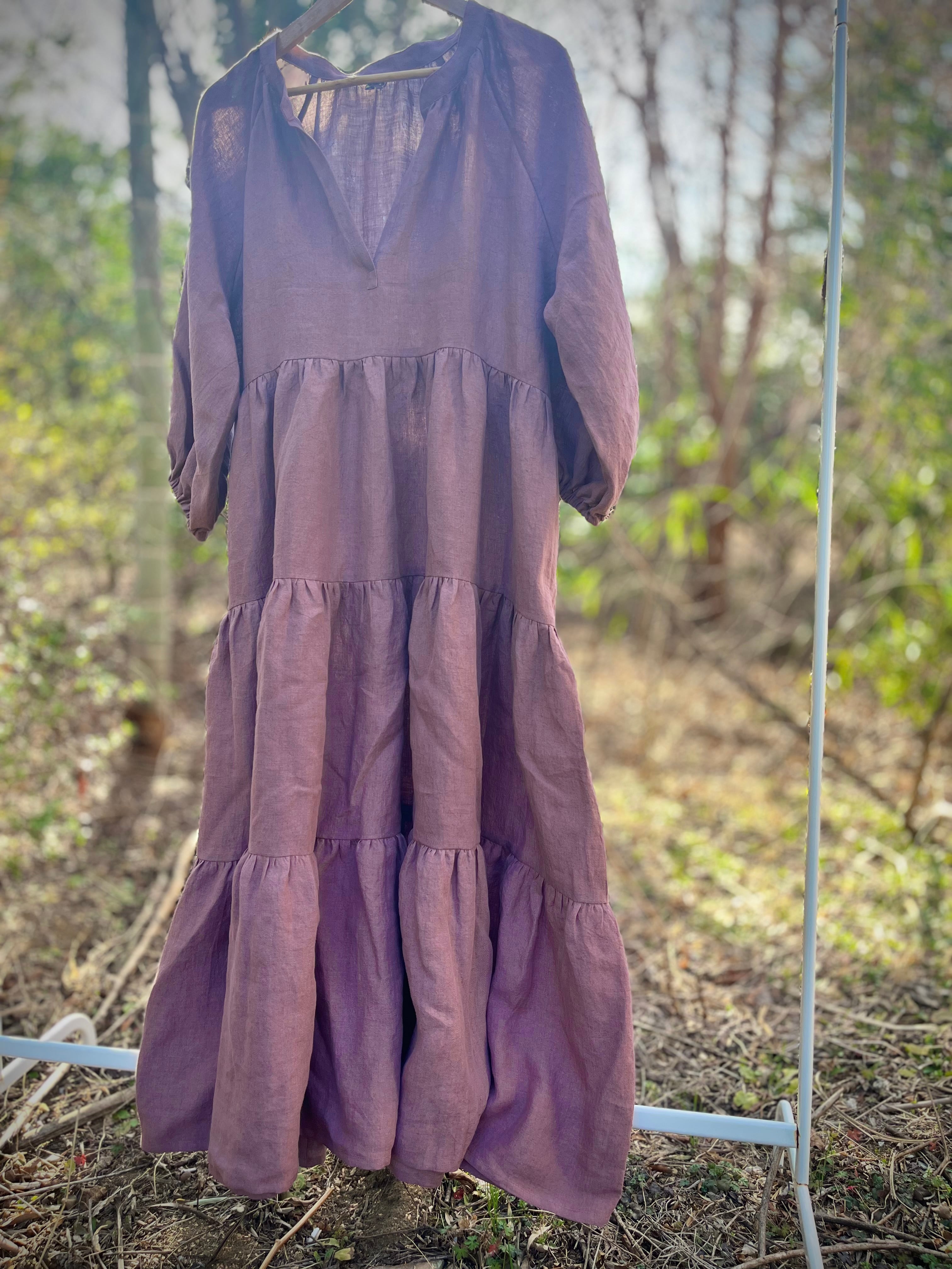 上質なベルギーリネンをたっぷり使ったティアードドレス。