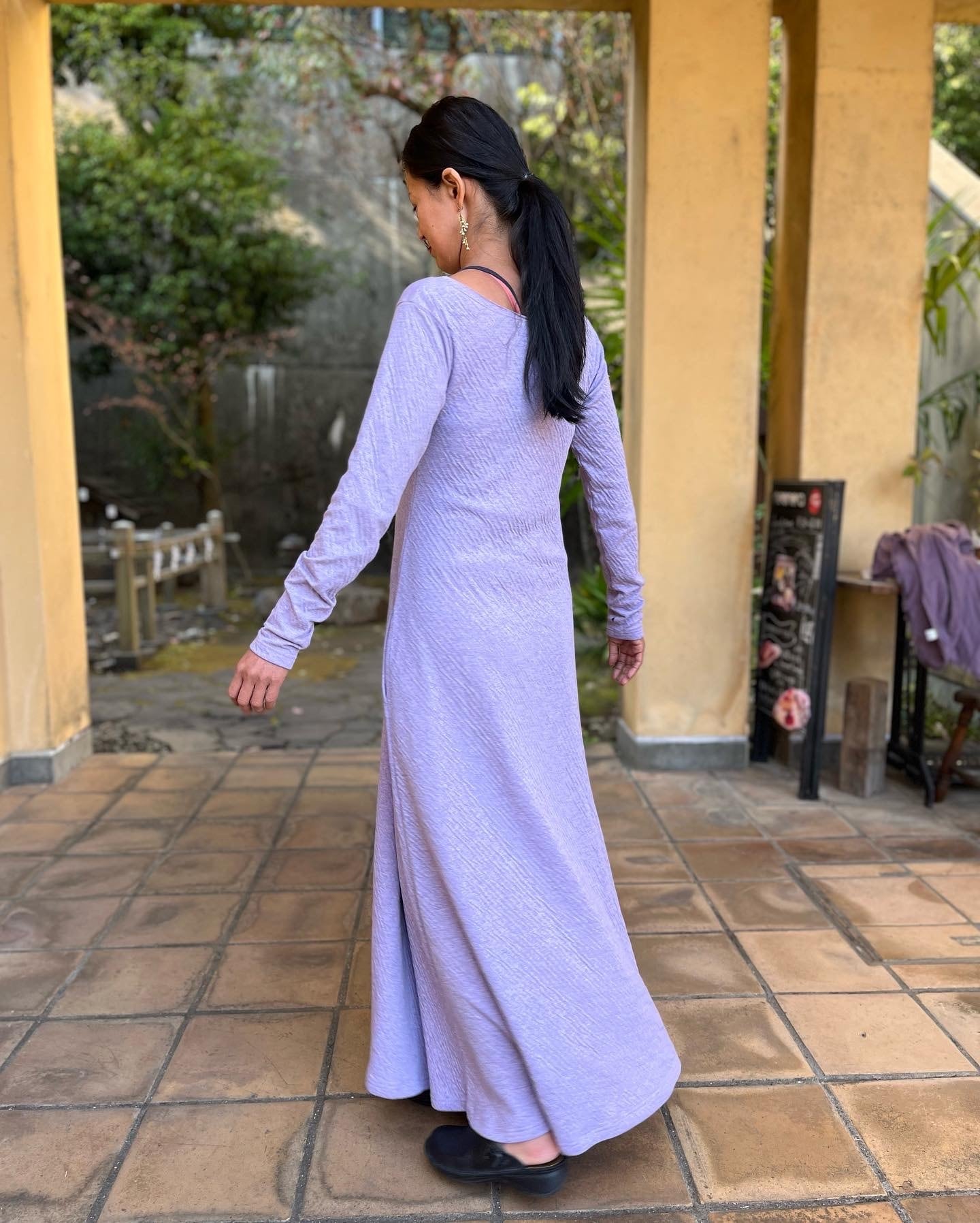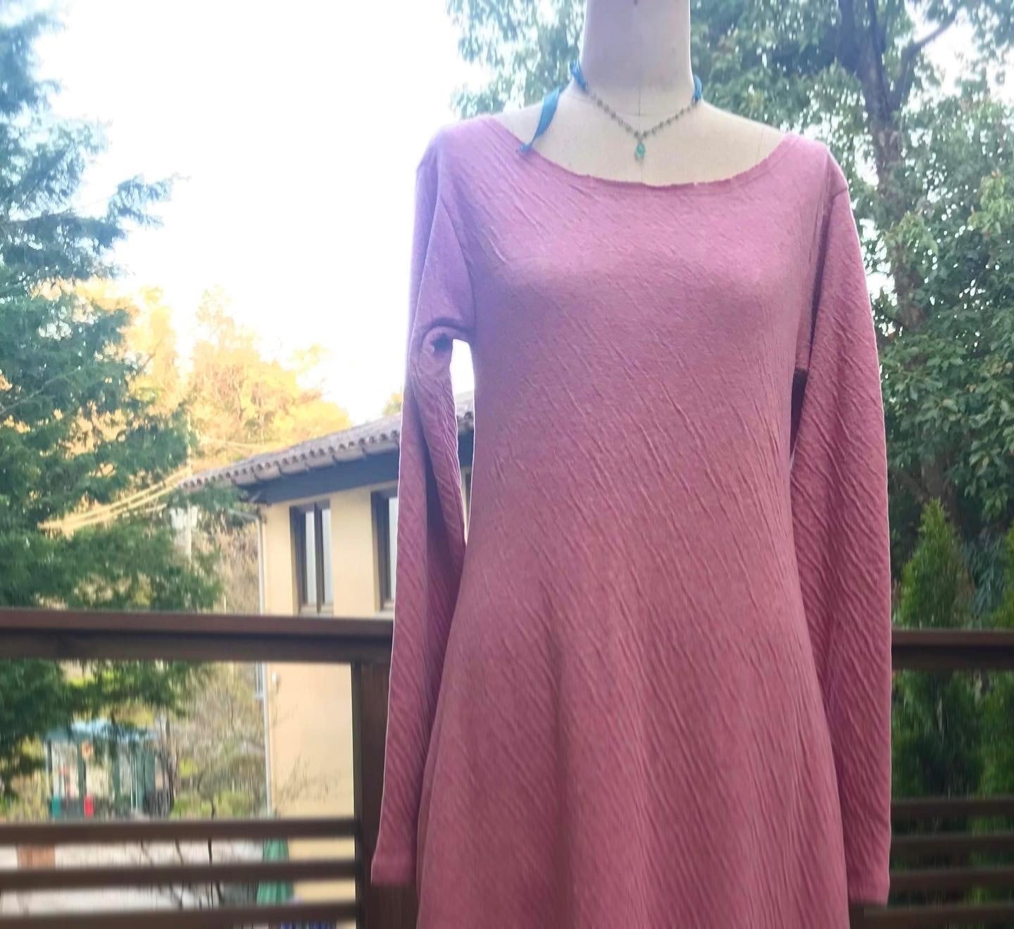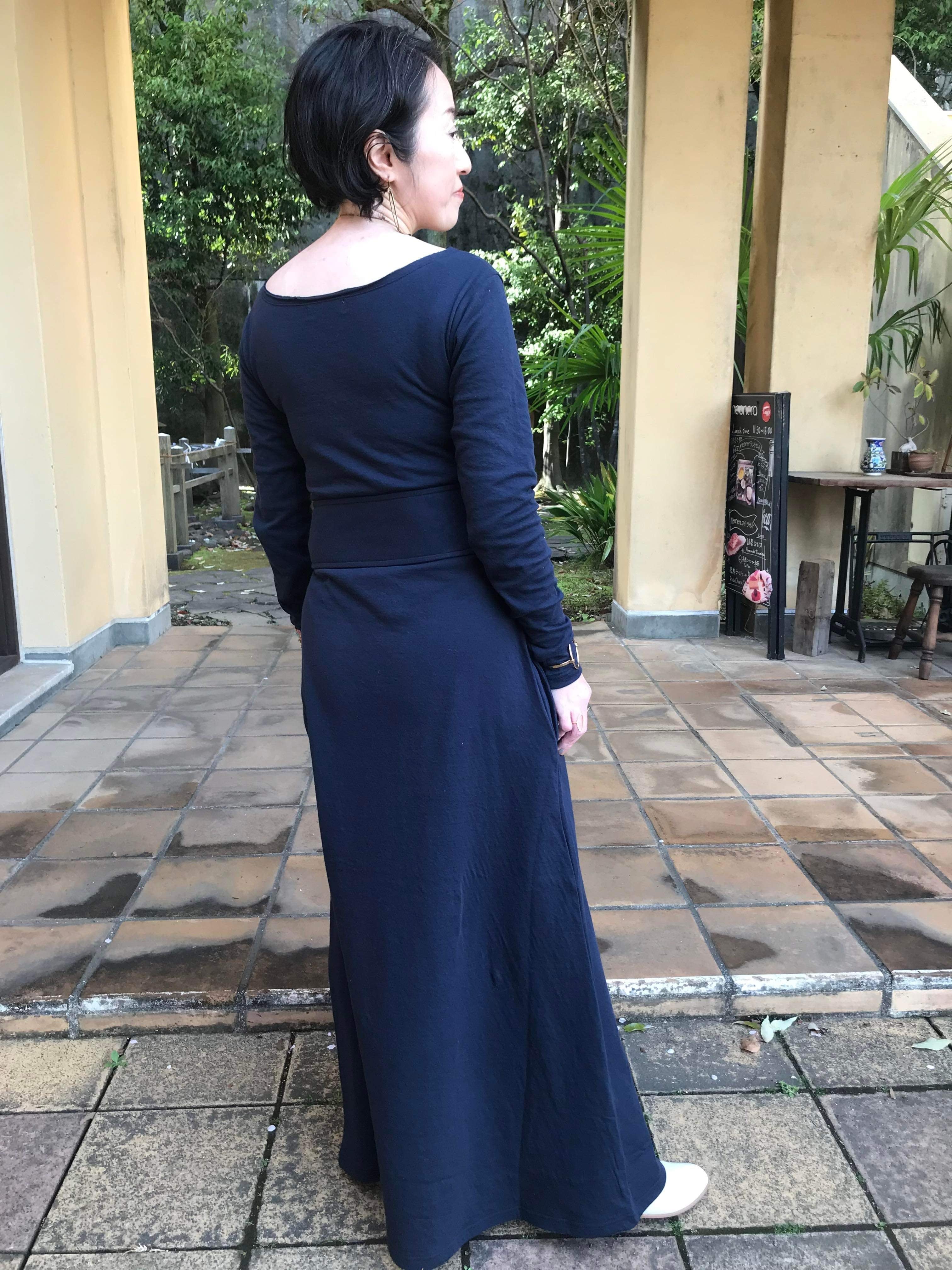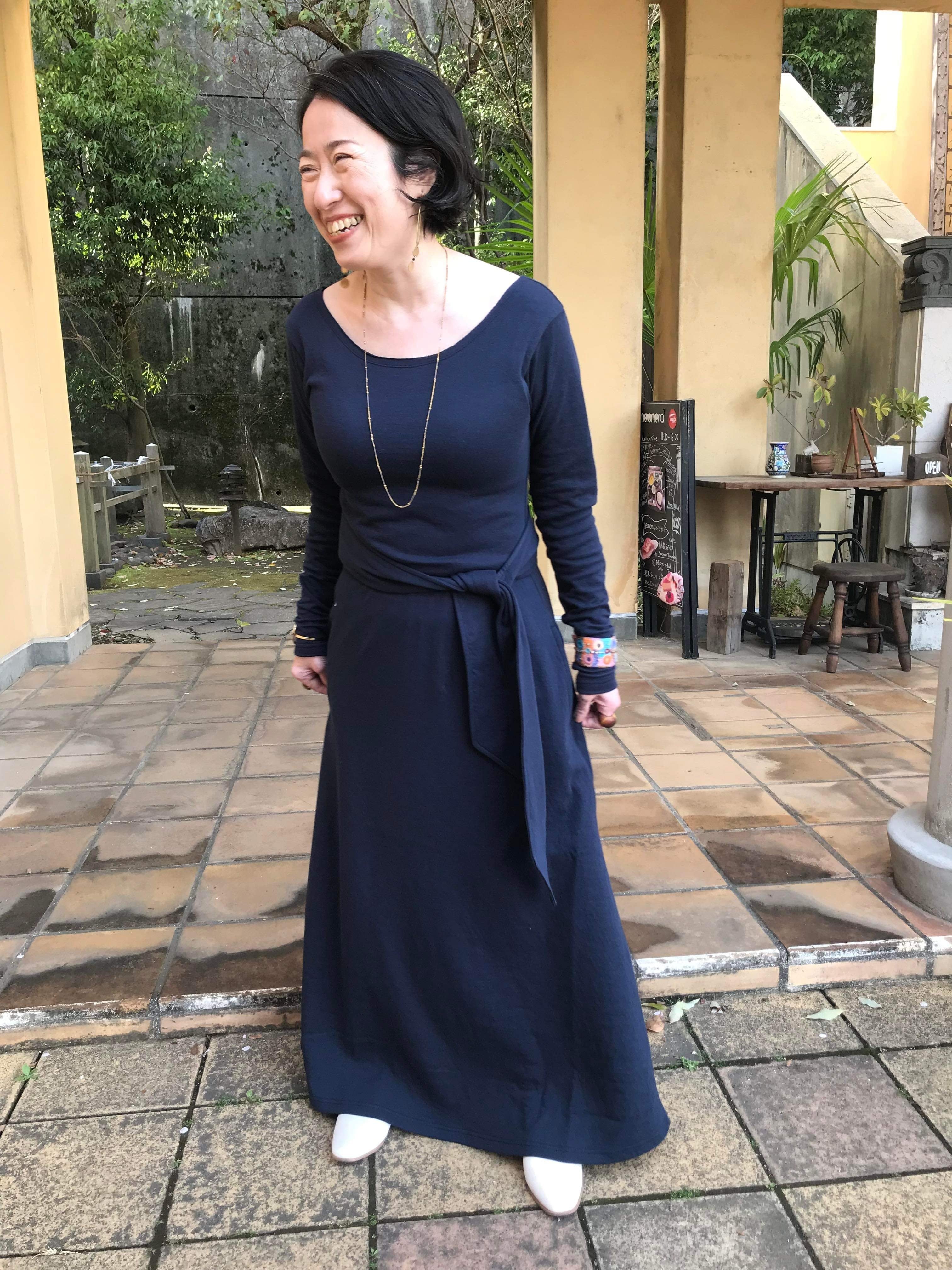 共布サッシュベルトでブラウジングして、着丈の変化も楽しめます。